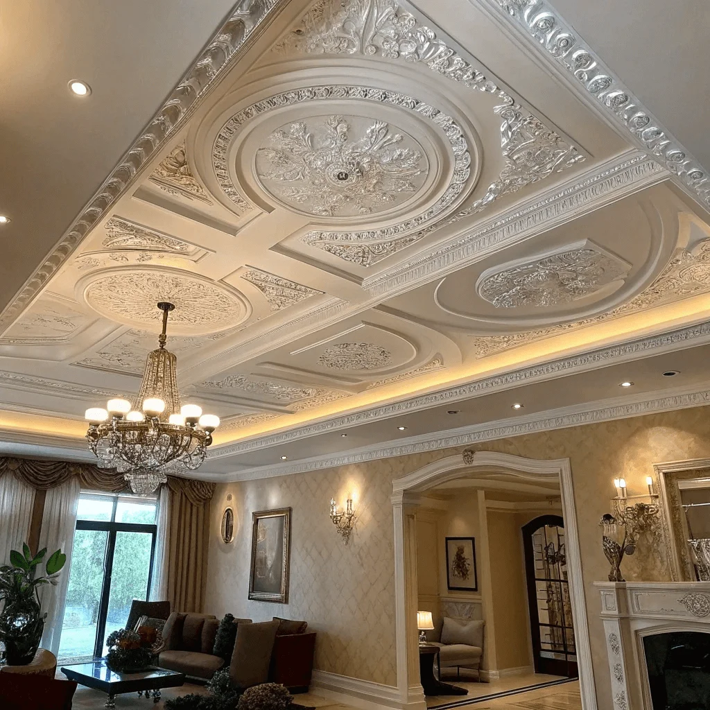 Pairing ornate plaster coving with a matching ceiling rose can create a dramatic and visually captivating ceiling feature. Ceiling roses work well with chandeliers or pendant lights, drawing the eye upward and enhancing the room’s overall ambiance. This combination is popular in formal dining rooms, grand entrance halls, and traditional living spaces.